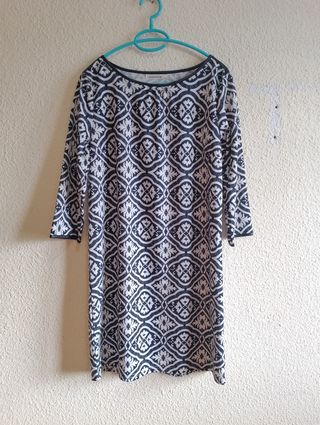 Vestido de manga larga con un llamativo estampado geométrico. - Diseño con cuello redondo. - Mangas hasta el codo. - Tejido ligero y cómodo.