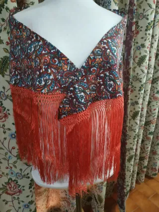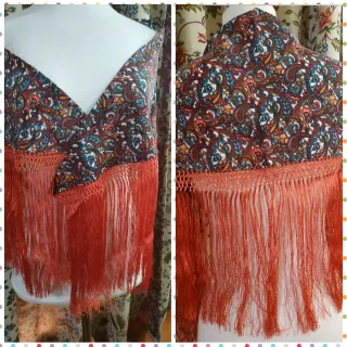 Precioso mantoncillo con flecos hechos a mano. - Diseño con estampado paisley. - Flecos largos en color naranja.