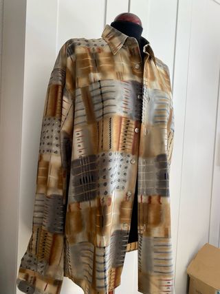 Conjunto de dos camisas de manga larga de la marca Mirto. Presentan un diseño abstracto con bloques de color y detalles gráficos. - Camisa 1: Estampado geométrico en tonos tierra y grises. - Camisa 2: Diseño similar con variaciones en el patrón. - Cuello clásico y cierre de botones.