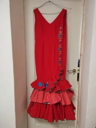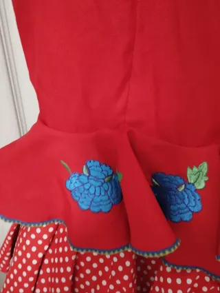 Traje de flamenca de color rojo, con un diseño elegante y detalles bordados. - Mangas a la sisa. - Volantes en la falda. - Bordados florales en el lateral. -Una pequeña tara que se puede arreglar como la *cremallera * -Con bolsillo interior. - 125 cm de largo.