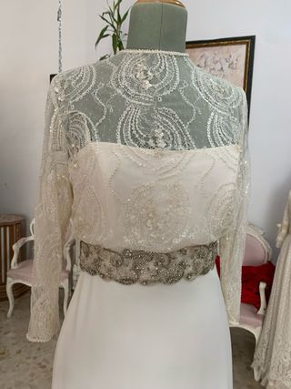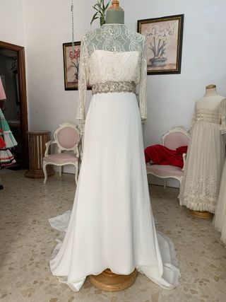 Elegante traje de novia con un diseño delicado y romántico. - Cuerpo con escote redondo y manga larga. - Cinturón adornado con pedrería. - Falda larga de tul con topos.