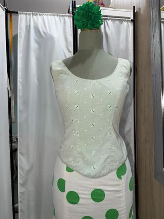Traje de flamenca con un diseño alegre y llamativo. - Cuerpo con detalles. - Falda larga con volantes. - Estampado de lunares verdes. Blusa: Pecho: 95 cm Cintura: 80 cm Cadera: 100 cm Falda Largo: 100 cm