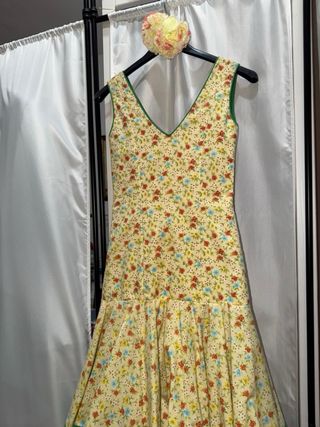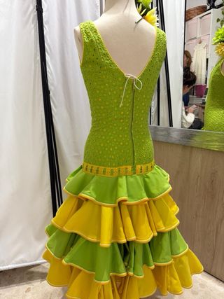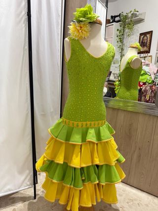 Traje de flamenca de niña con un alegre estampado floral sobre fondo amarillo. Presenta un diseño de volantes escalonados y un ribete verde que le da un toque de contraste. - Diseño de volantes en cascada. - Ribete verde en cuello y volantes. medidas del traje: Pecho: 62 cm Cintura: 55 cm Cadera: 74 cm Largo total: 121 cm (medido desde el hombro hasta el bajo)