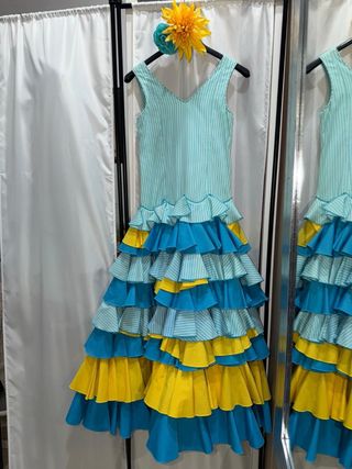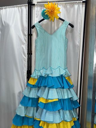 Traje de flamenca para niña con un diseño alegre y lleno de volantes. - Cuerpo de rayas celestes. - Múltiples volantes escalonados en la falda. - Combinación de colores vibrantes. Pecho: 62 cm Cintura: 60 cm Cadera: 68 cm Largo total: 117 cm (medido desde el hombro hasta el bajo)