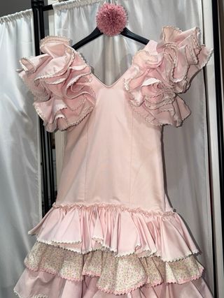 Precioso traje de flamenca para niña con múltiples volantes. - Diseño con volantes en cascada. - Combina tela lisa rosa con estampado floral. - Mangas abullonadas con volantes. Medidas Pecho: 64 cm Cintura: 56 cm Cadera: 66 cm Largo total: 104 cm (medido desde el hombro hasta el bajo)