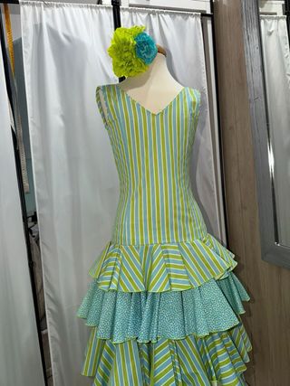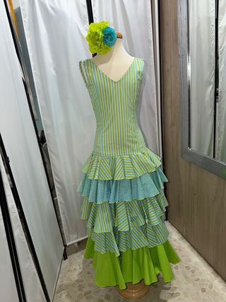 Traje de flamenca con un diseño alegre y vibrante, perfecto para ferias y celebraciones. - Cuerpo a rayas verticales en verde y azul. - Falda con múltiples volantes escalonados. - Volantes inferiores en diferentes estampados y colores. - Adorno floral en la cabeza a juego. Medidas Pecho: 68 cm Cintura: 60 cm Cadera: 78 cm Largo total: 124 cm (medido desde el hombro hasta el bajo)