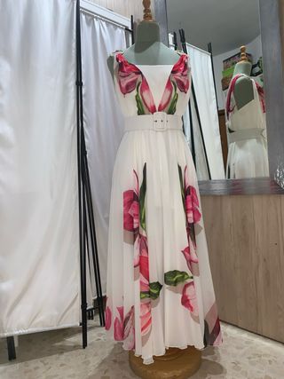 Elegante traje de mujer con un estampado floral vibrante. Perfecto para ocasiones especiales. - Diseño sin mangas. - Cinturón blanco a juego. - Falda larga y fluida.