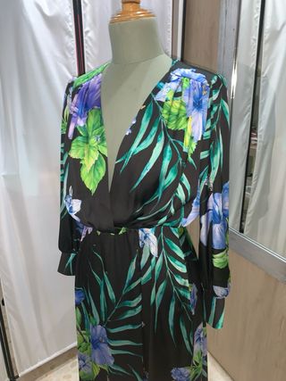Vestido largo con un llamativo estampado de flores y hojas tropicales sobre fondo negro. Presenta un escote cruzado y mangas largas. - Diseño cruzado en el escote. - Mangas largas abullonadas. - Largo midi.