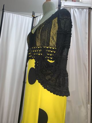Traje de flamenca con un diseño llamativo y elegante. - Cuerpo con mangas largas de encaje negro. - Falda con volantes y lunares negros sobre fondo amarillo. - Detalle de encaje en la cintura y en los volantes de la falda.