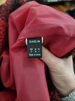 Abrigo estilo oversize de la marca Shein, con un diseño de cuadros en rojo y negro. - Material: 100% poliéster. - Corte amplio y cómodo.