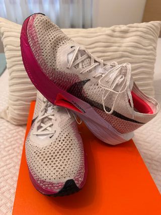 Zapatillas de running Nike Vaporfly Next% 3. - Diseño en blanco y rosa. - Talla 43. Nike Vaporfly %3 T43. Zapatillas Voladoras de competicion para entrenos rapidos y carreras... 80-90 km aprox. No me hago a ellas.
