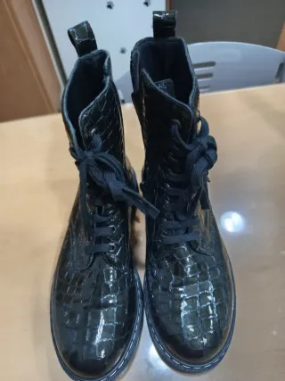 Botines de piel con un diseño moderno y detalles llamativos. - Acabado texturizado tipo cocodrilo. - Tres correas con hebillas metálicas. - Suela gruesa y resistente.