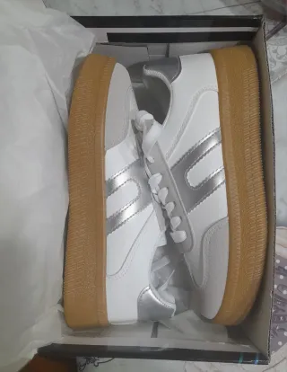 Zapatillas White Silver nuevas con un diseño moderno y elegante en su caja por si las quieres regalar. Talla 37 - Combinación de materiales de alta calidad. - Detalle de franja lateral plateada. - Suela de goma resistente.