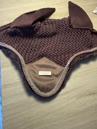 Orejeras de la marca Equestrian Stockholm en color morado. Diseñadas con un tejido de punto y adornos. - Detalle de cuerda plateada y beige. - Orejas de tela.