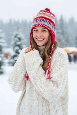 Gorro tejido de estilo peruano con un diseño llamativo. - Motivos de llamas y patrones geométricos. - Orejeras para mayor protección. - Pompones decorativos en la punta y las orejeras.