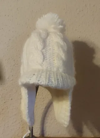 Gorro de punto con diseño trenzado y pompón. - Detalle de orejeras para mayor protección. - Trenzado grueso y cálido. - Pompón decorativo en la parte superior. - Etiqueta de la marca visible. - En perfecto estado, muy poco uso.