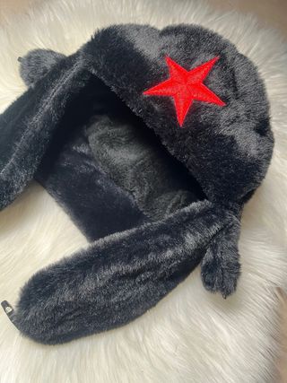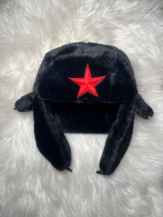 Gorro estilo ruso con un diseño llamativo. - Material de pelo sintético. - Detalle de estrella roja bordada en la parte frontal. - Orejeras para mayor protección.