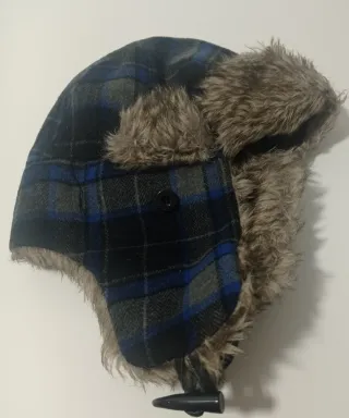 Gorro de invierno con orejeras. Diseño a cuadros en tonos azules. Forro interior acolchado. Pelo sintético.