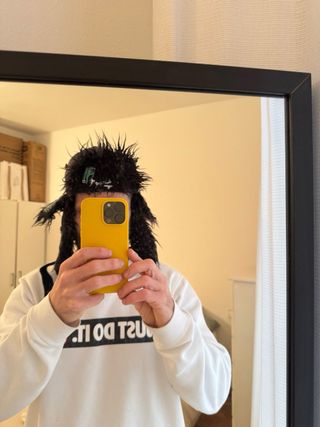 Gorro de invierno con un diseño llamativo y peludo. Con orejeras de la marca Quiksilver. Estoy en Barcelona