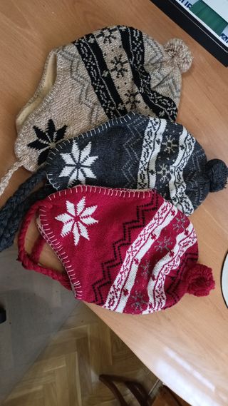 Gorro de estilo peruano con orejeras y diseño tejido. - Diseño con motivos de copos de nieve y patrones geométricos. - Pompones decorativos en la parte superior. - Trenzas laterales. - Forro interior suave. Nuevos, a estrenar. Entrega en mano Madrid