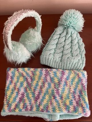 Conjunto de invierno que incluye gorro, bufanda y orejeras. En perfecto estado, apenas se uso 1 vez De muy buena calidad - Gorro de punto trenzado con pompón. - Orejeras de pelo sintético con diadema brillante. - Bufanda reversible con diseño de zig-zag multicolor.
