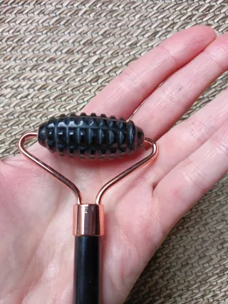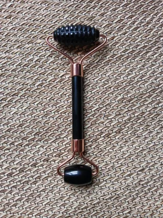 Rodillo facial con un diseño elegante y materiales de calidad. - Rodillo de obsidiana. - Marco de metal rosado