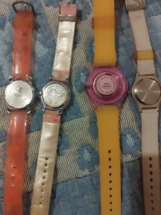 Conjunto de cuatro relojes con diseños infantiles. - Correa con personajes de Bratz. - Correa con motivos de Hello Kitty y cupcakes. - Correa con gatos y lazos. - Correa con huellas de patitas.