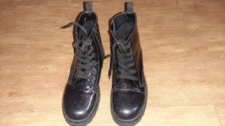 Botas de estilo combate con acabado brillante y detalles de purpurina. - Cierre con cordones y cremallera lateral. - Tirador trasero para facilitar su puesta. - Suela de goma gruesa. Muy buena condición, solo puestas un par de veces.