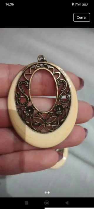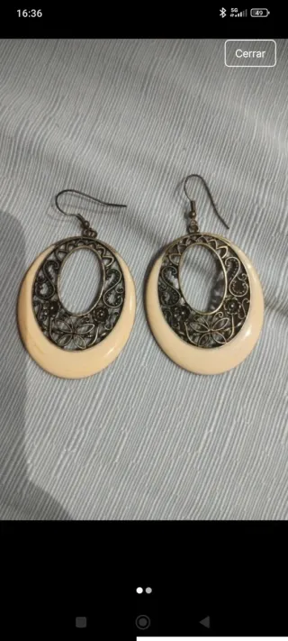 Elegantes pendientes con un diseño ovalado y detalles calados. - Combinación de tonos dorados y beige. - Diseño intrincado con motivos florales.