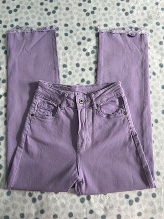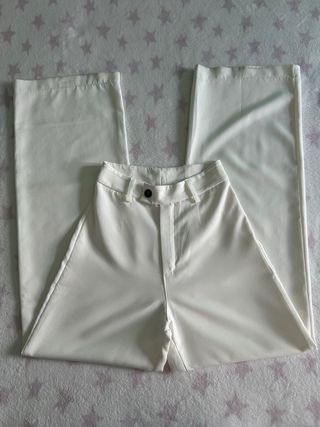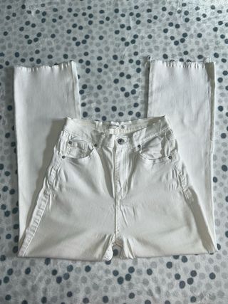 Vaqueros rectos de color blanco. Tienen un corte moderno y favorecedor. - Diseño de tiro alto. - Bajo deshilachado. - Bolsillos delanteros y traseros. Como nuevos, esta en perfecto estado como se puede ver el las fotos, pero tiene una mini mancha en la parte de atras, son super comodos y quedan genial, son ideales para el dia a dia o para salir a tomar algo, todas las medidas vienen en la ultima foto, envios en 24h y con detalles ⭐️