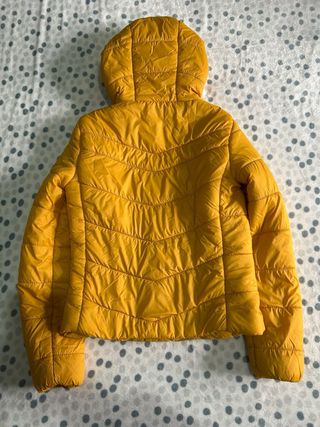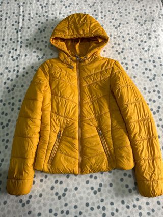 Chaqueta acolchada de color amarillo con capucha. - Cierre de cremallera. - Dos bolsillos laterales con cremallera. - Capucha ajustable con cordón. Poco usada , es super calentita, el gorro tiene ajustes por si lo quieres más apretado o no, queda super bien y es genial para todo tipo de ocasiones, envios rapidos y con detalles ⭐️