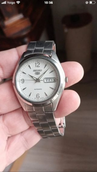 Reloj de pulsera Seiko 5 con movimiento automático. - Esfera blanca. - Indicador de día y fecha. - Correa de metal. - Resistente al agua.