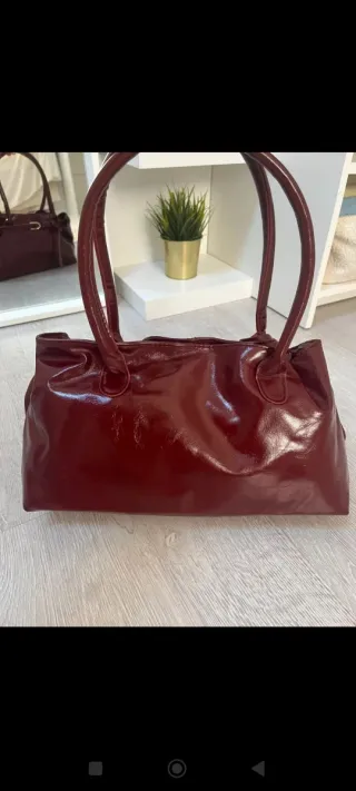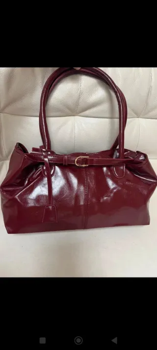 Elegante bolso de mano con acabado brillante. - Color burdeos intenso. - Asa de mano. - Detalle de cinturón con hebilla dorada. - Color burdeos.