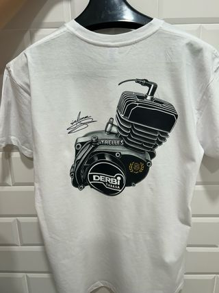 Camiseta personalizada blanca con el logo de Derbi. - Diseño frontal con el nombre de la marca - Diseño esoalds con motor - Cuello redondo. - Manga corta. Se personalizan en todas las tallas y colores .