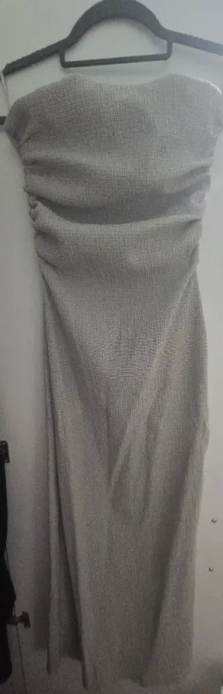 Vestido largo sin tirantes en color beige. Banda de silicona en escote para un mejor agarre. Presenta un diseño fruncido en la parte superior. - Tejido con textura. - Corte ceñido.