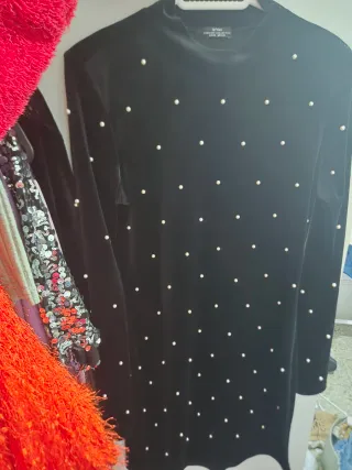 Vestido elegante de manga larga con un diseño único. - Tejido de terciopelo negro. - Adornado con perlas blancas. - Corte moderno.