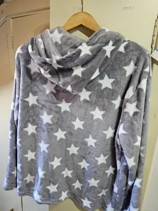 Conjunto de pijama para mujer con un divertido estampado de estrellas. La blusa es de manga larga y cuenta con un bolsillo canguro. - Diseño de estrellas blancas sobre fondo gris. - Tejido suave y confortable.