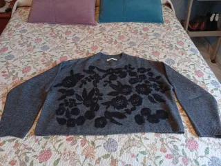 Jersey de punto gris con un bonito bordado floral en la parte delantera. Es una prenda cómoda y con un diseño llamativo. - Diseño de flores bordadas en negro. - Manga larga. - Cuello redondo.