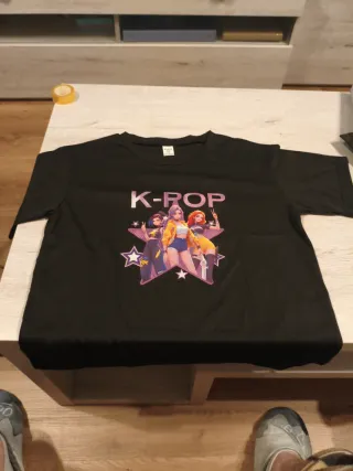 Camiseta negra con un llamativo diseño frontal inspirado en el K-pop. - Estampado con tres figuras femeninas y estrellas. - Cuello redondo y manga corta. - Talla 10