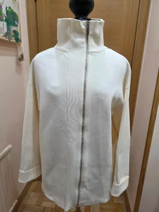 Chaqueta de punto con cuello alto y cremallera. - Diseño moderno y elegante. - Tejido confortable. - Cremallera plateada. medidas sisa 56cm largo 64cm hombros 46,48 talla grande a estrenar