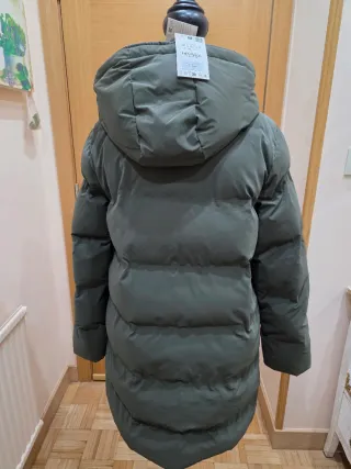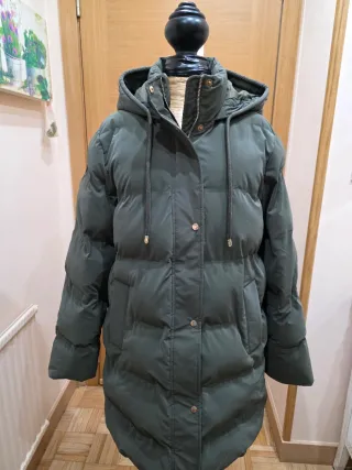 Parka acolchada con capucha de Zara, ideal para el frío. Es una prenda de abrigo elegante y funcional. - Cierre de cremallera y botones a presión. - Bolsillos frontales. - Cordones ajustables en la capucha. medidas sisa 53 cm largo 90cm