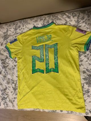 Camiseta de fútbol de Brasil, - Diseño oficial de Nike. - Número 20 de Vinícius Jr. estampado. - Escudo de la CBF y logo de Nike. - Detalles en verde y azul en cuello y mangas.