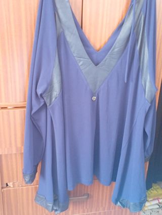 Blusa de talla grande con un diseño moderno y detalles que la hacen única. - Escote en V con aplicaciones. - Mangas largas. - Bajo asimétrico con detalles.
