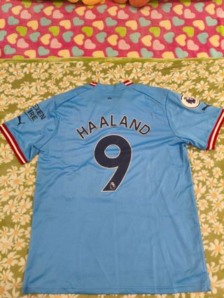Camiseta de fútbol del Manchester City, modelo de Erling Haaland. - Diseño con el escudo del club y el logo de Puma. - Cuello y mangas con detalles en rojo y blanco. - Inscripción 'ETIHAD AIRWAYS' en el frontal.