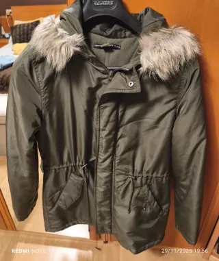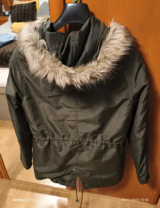 Cazadora de estilo parka con capucha y detalles de pelo sintético. - Cierre de cremallera y botones a presión. - Cintura ajustable con cordón. - Bolsillos frontales con solapa.
