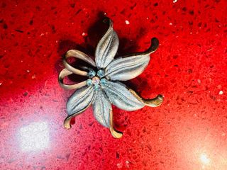 Elegante broche con diseño de flor. Sus pétalos metálicos y el detalle central de cristales le dan un toque especial. - Diseño de flor. - Detalle de cristales en el centro. - Acabado metálico.