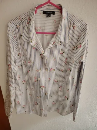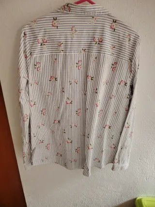 Camisa de manga larga con un diseño de rayas verticales azules y blancas, adornada con un estampado floral en tonos rosas y verdes. - Cuello camisero. - Cierre de botones. - Estampado de rayas y flores.