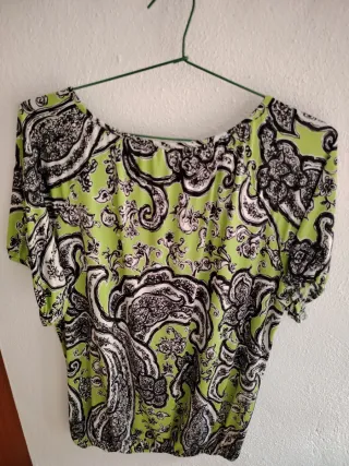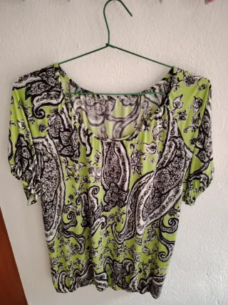 Camiseta elástica con un diseño llamativo y vibrante. Su estampado paisley la hace única. - Mangas cortas abullonadas. - Cuello redondo. - Tejido elástico para mayor comodidad. -Talla grande.
