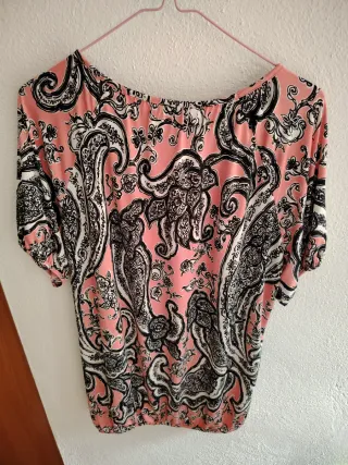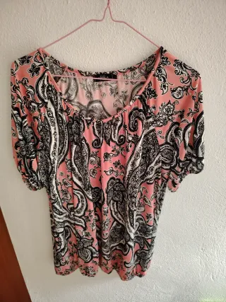 Camiseta de vestir con un llamativo estampado. - Diseño de paisley y flores. - Manga corta. - Cuello redondo. -Da más talla.