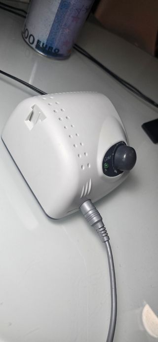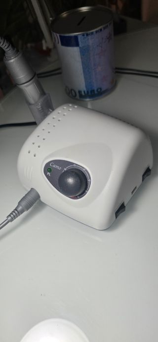 Torno eléctrico para manicura y pedicura, ideal para el cuidado de las uñas. - Diseño compacto y moderno. - Control de velocidad ajustable. - Incluye pieza de mano y cable de conexión.